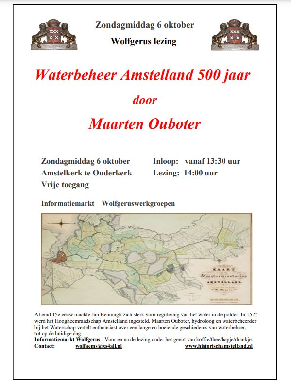Affiche Oktoberlezing 6 oktober 2024 Waterbeheer Amstellend 500 jaar